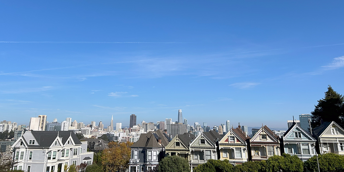 Utsikt över San Francisco och Painted Ladies. Viktorianska hus byggda i trä med mycket snickarglädje och färg, typiska för staden.